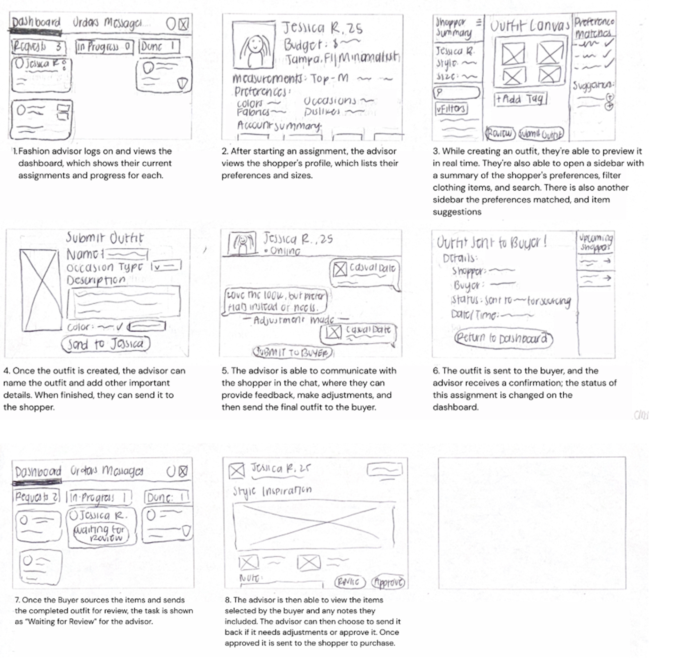 This meant prioritizing user preferences and ensuring that shoppers had a variety of products to choose from. Also, an important aspect of the process was placing the least amount of burden on the shopper. Throughout our process, our main goal was to generate a channel that maintains good communication between all of the necessary components. During development, our goal was to create a balance between efficiency for the advisor and personalization for the shopper. We structured the flow so advisors could easily access the shoppers' preferences, filter through clothing options, and communicate updates clearly. Maintaining cohesion with the shopper and buyer flows helped visualize how information and actions move effortlessly between all three roles. Looking back, the process would’ve benefitted from establishing a clear information hierarchy map early on, before moving into sketching and wireframing. While storyboarding helped visualize each step of the journey, it became clear that mapping the relationships between the three different storyboards would speed up the design process - which is what we ended up doing even though it was not explicitly mentioned in the project requirements. The iterative process still proved valuable, as each storyboard informed the other, but a more deliberate hierarchy mapping could have made all three user experiences a lot more cohesive.